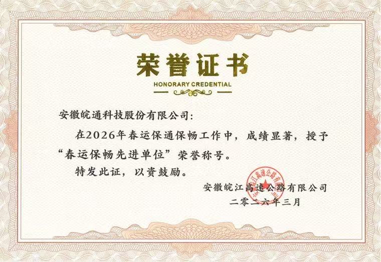 近日,皖通科技在2026年春運(yùn)保通保暢工作中,成績(jī)顯著,被安徽皖江高速公路有限公司授予“春運(yùn)保暢先進(jìn)單位”榮譽(yù)稱號(hào)。此項(xiàng)榮譽(yù),是對(duì)皖通科技在銅商高速銅陵至無(wú)為段機(jī)電系統(tǒng)維護(hù)維修(2023-2026年度)項(xiàng)目工作成效的高度認(rèn)可,也彰顯了公司在行業(yè)內(nèi)的專業(yè)技術(shù)能力與優(yōu)質(zhì)服務(wù)水平。